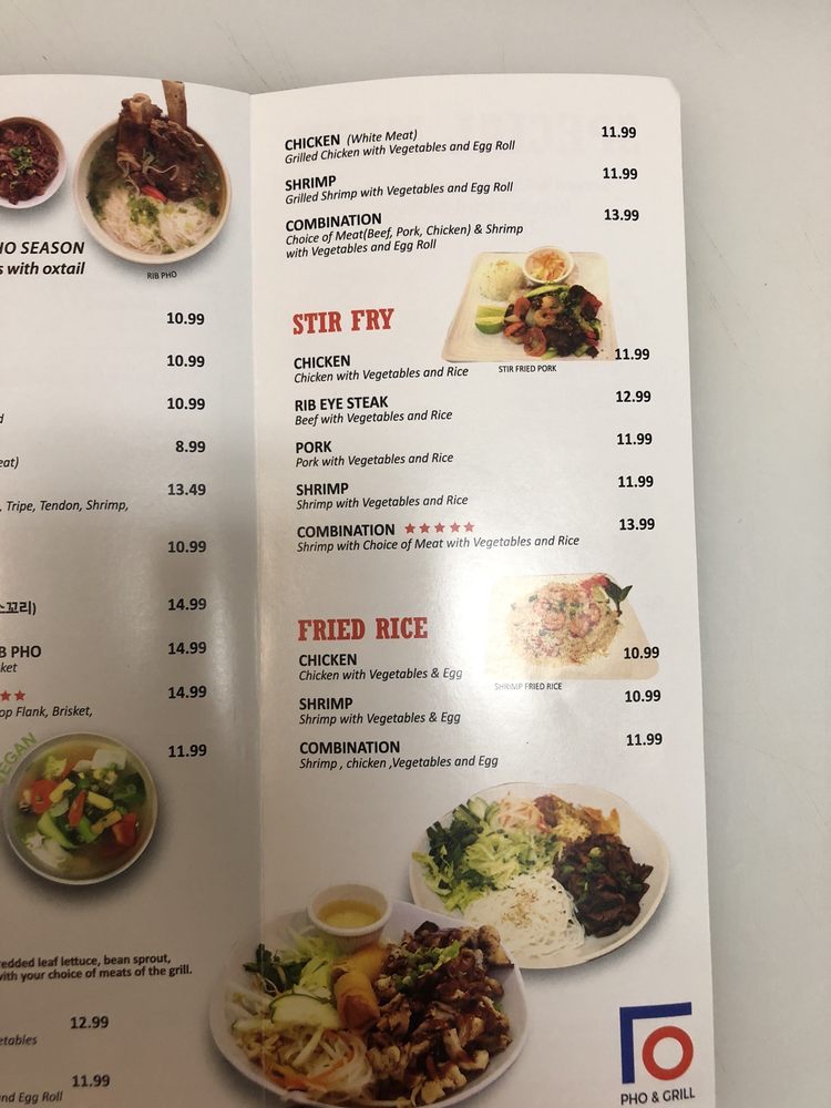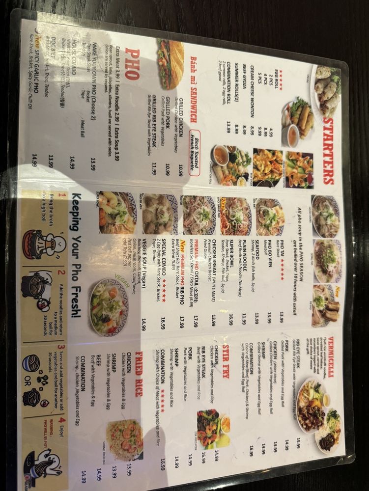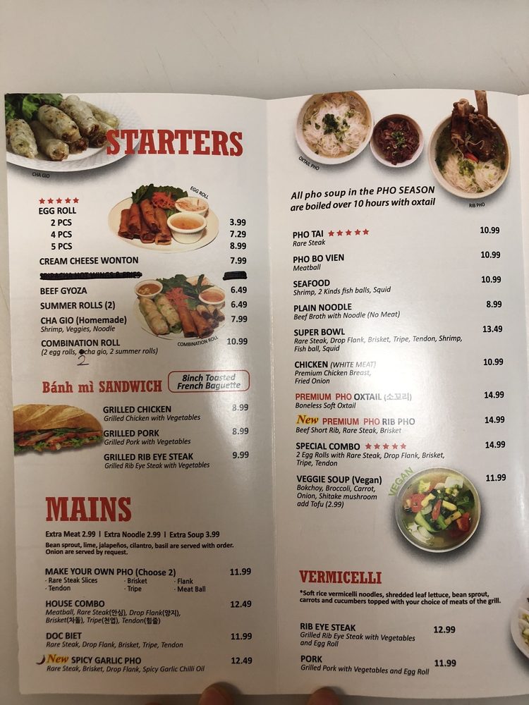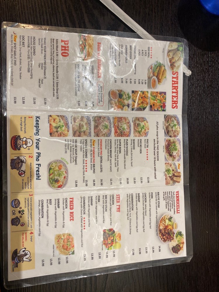 Rare steak, brisket, tripe, tendon, shrimp, fish ball, crab stick, squid. Bean sprout, lime, jalapeos, cilantro, basil served with the order. Onions by request. Pho soup in the pho season boiled over 10 hours with oxtail.