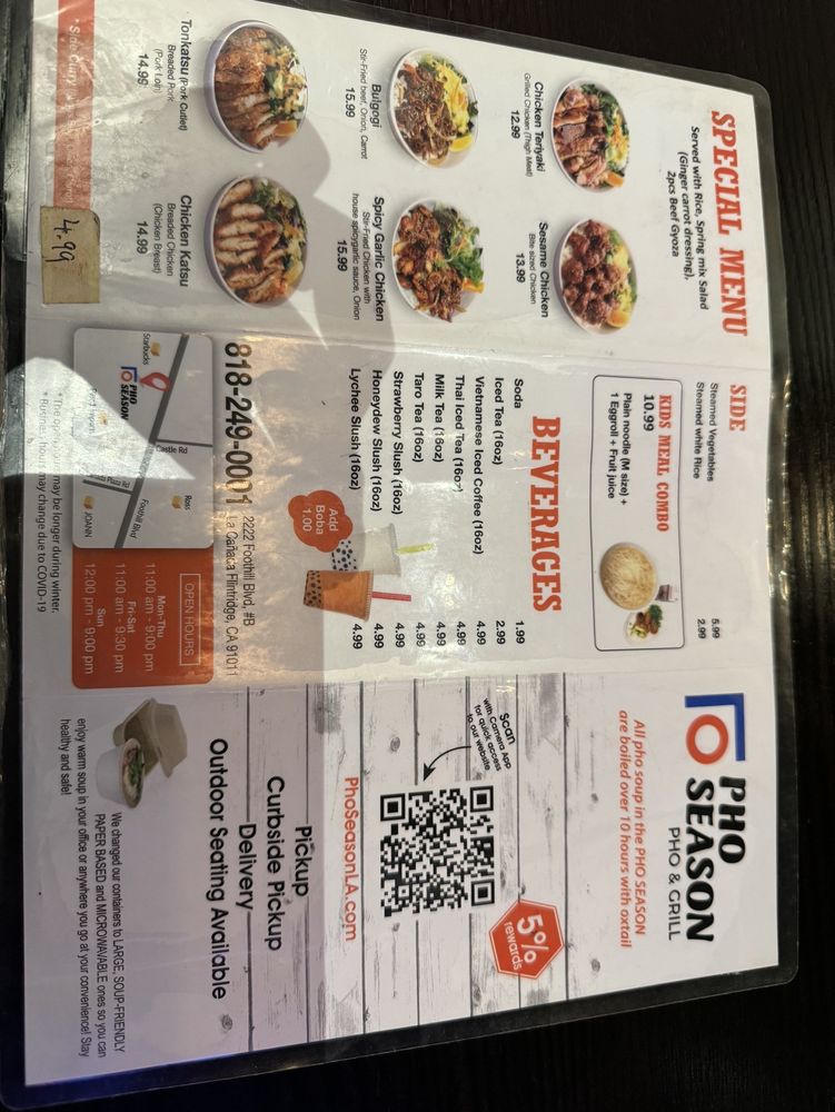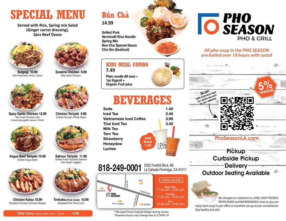 Welcome to Pho Season, a Vietnamese gem located in La Cañada Flintridge, CA. Known for its flavorful bone broth pho and delicious starters like egg rolls and summer rolls, this restaurant offers a diverse menu with options for everyone, including vegetarians and vegans. The banh mi sandwiches are a must-try, with choices like grilled chicken and rib eye steak served on toasted French baguettes. Customers rave about the friendly staff and top-notch service, making dining here a delightful experience. With options for takeout, delivery, and catering, Pho Season is a versatile spot for any occasion. Don't miss out on their refreshing drinks like Vietnamese iced coffee and taro slush. Experience the authentic flavors of Vietnam at Pho Season today.